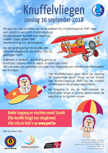 Deze knuffeldag zal doorgaan op zondag 30 september 2018 vanaf 10 uur op het veld van PMF, gelegen op het militair schietveld in Houthalen-Helchteren. De toegang en de vluchten zijn gratis. Het einduur is voorzien rond 17 uur.